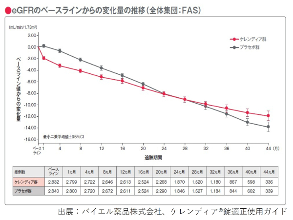 ケレンディアの場合も、飲み始めてから4か月程度はeGFRの低下が認められ、その後は(飲まない場合に比べて)eGFRの低下スピードが緩やかになるようです。