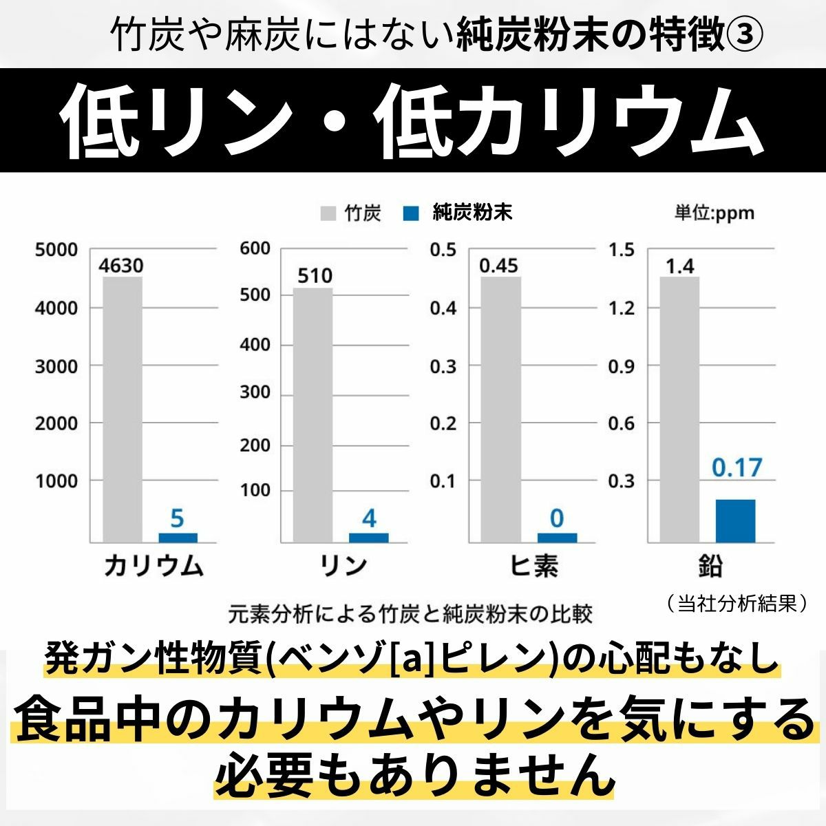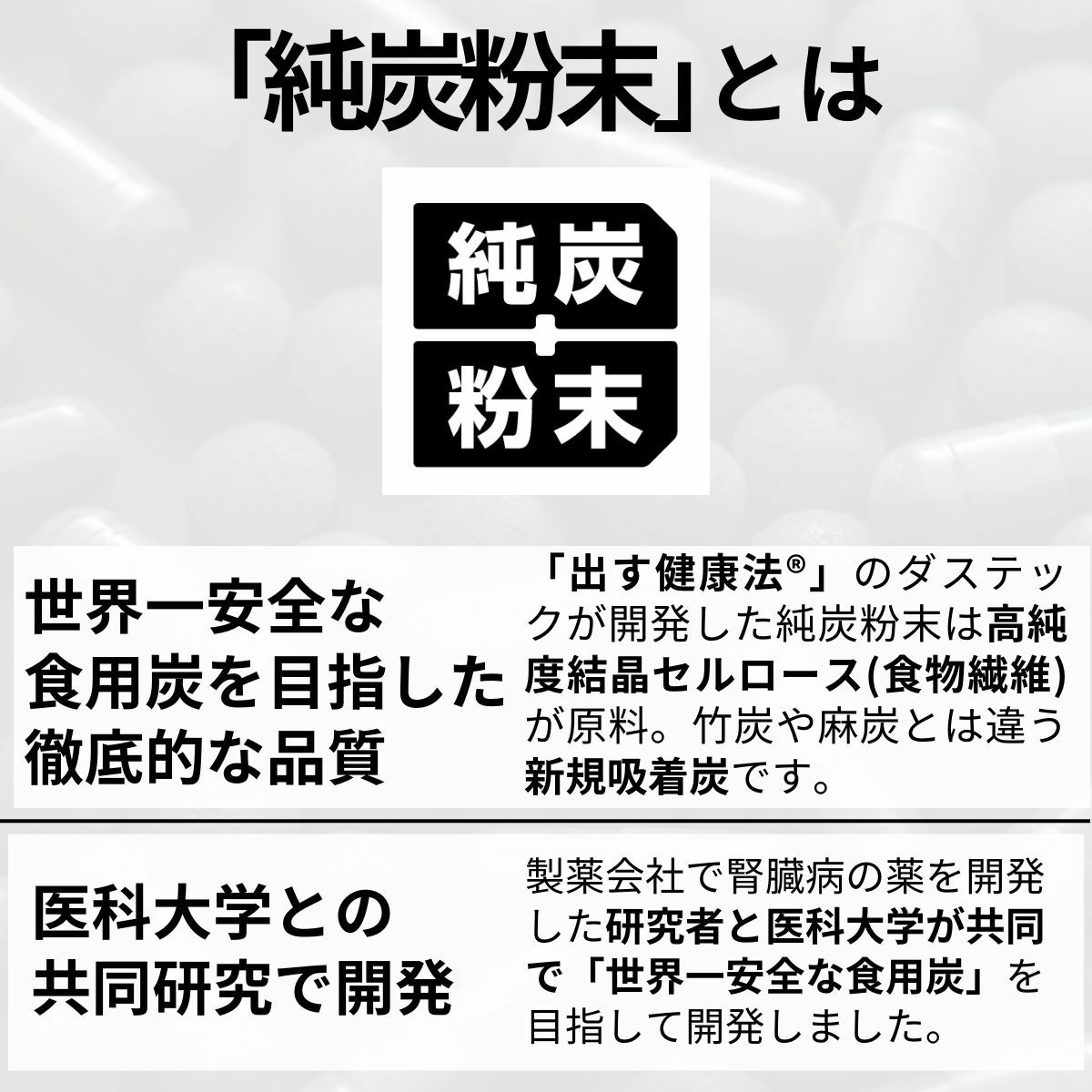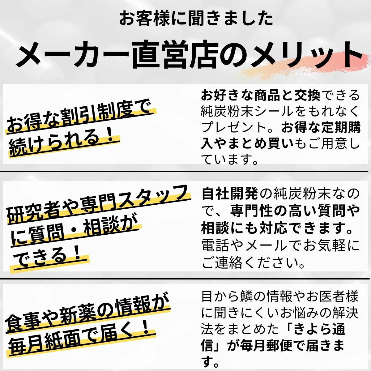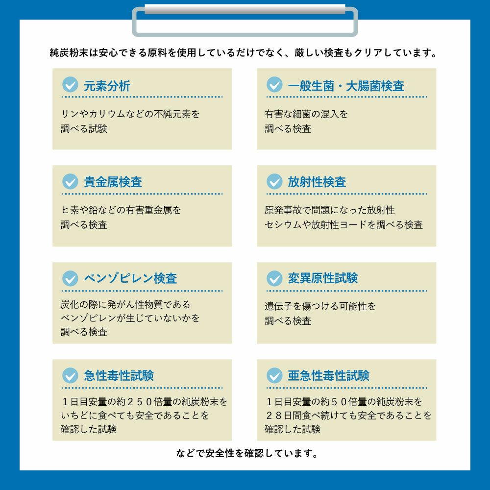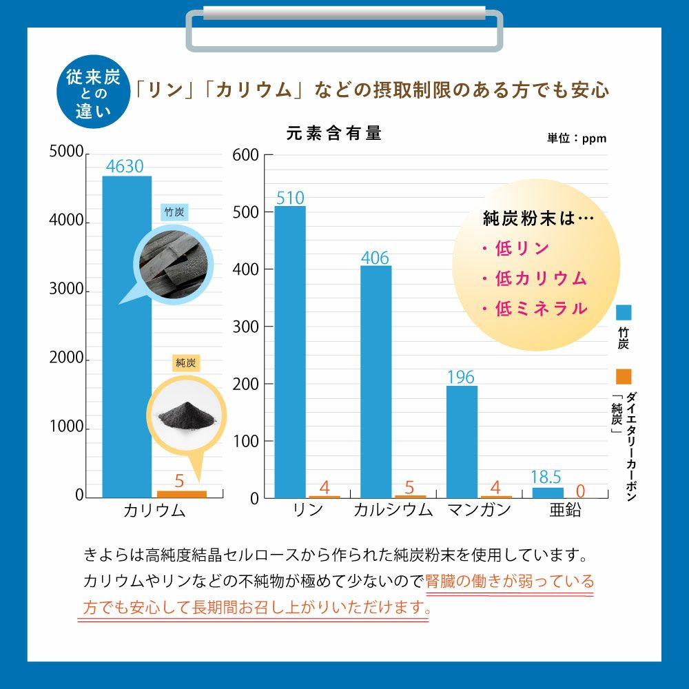 食べる純炭きよらは、食事制限が必要な方でも安心して長期間飲み続けて頂けるように(株)ダステックが開発した特殊な炭であり重金属検査や毒性試験といった安全性試験、そして成分分析も行っている純炭粉末サプリです。