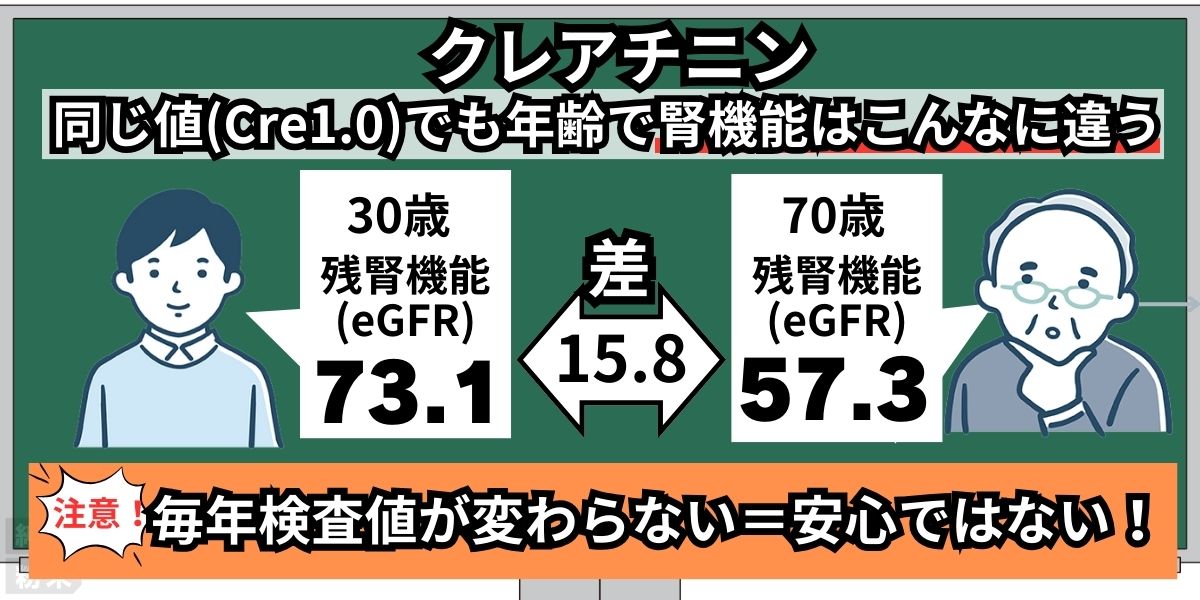 例として、血液検査でクレアチニンが1.0 (mg/dL)と出ても30歳男性のeGFRは73(正常)ですが、70歳男性のeGFRは53(慢性腎不全ステージ3a)と全く違う結果になってしまいます。