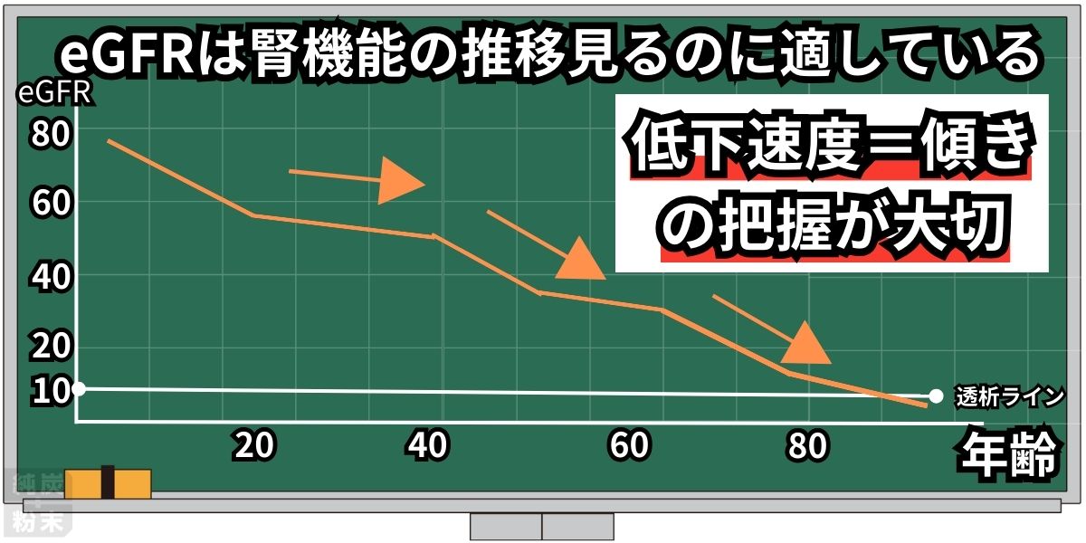 腎機能は加齢とともに低下していきますが、同世代よりもeGFRが低いと注意が必要です。